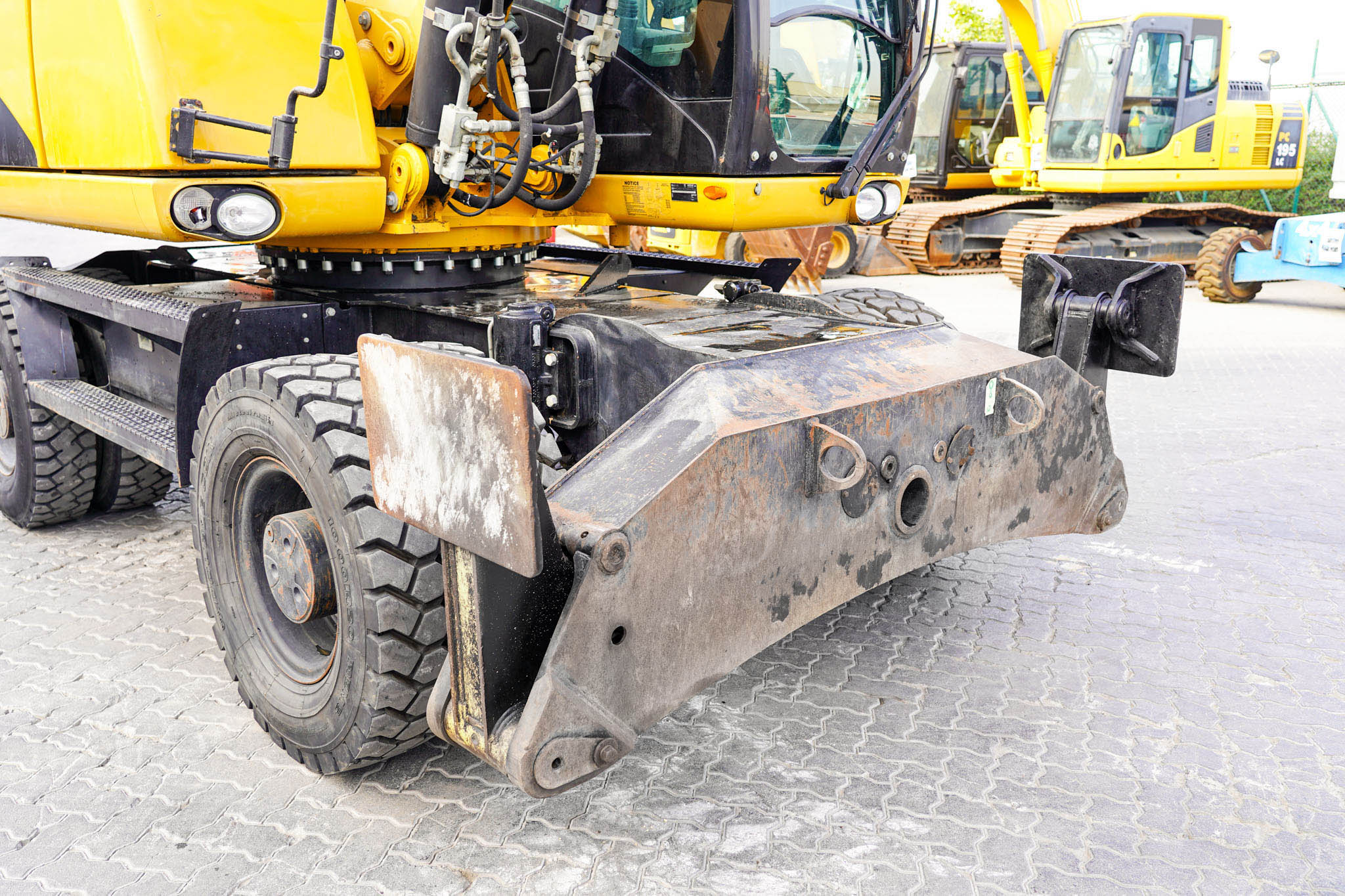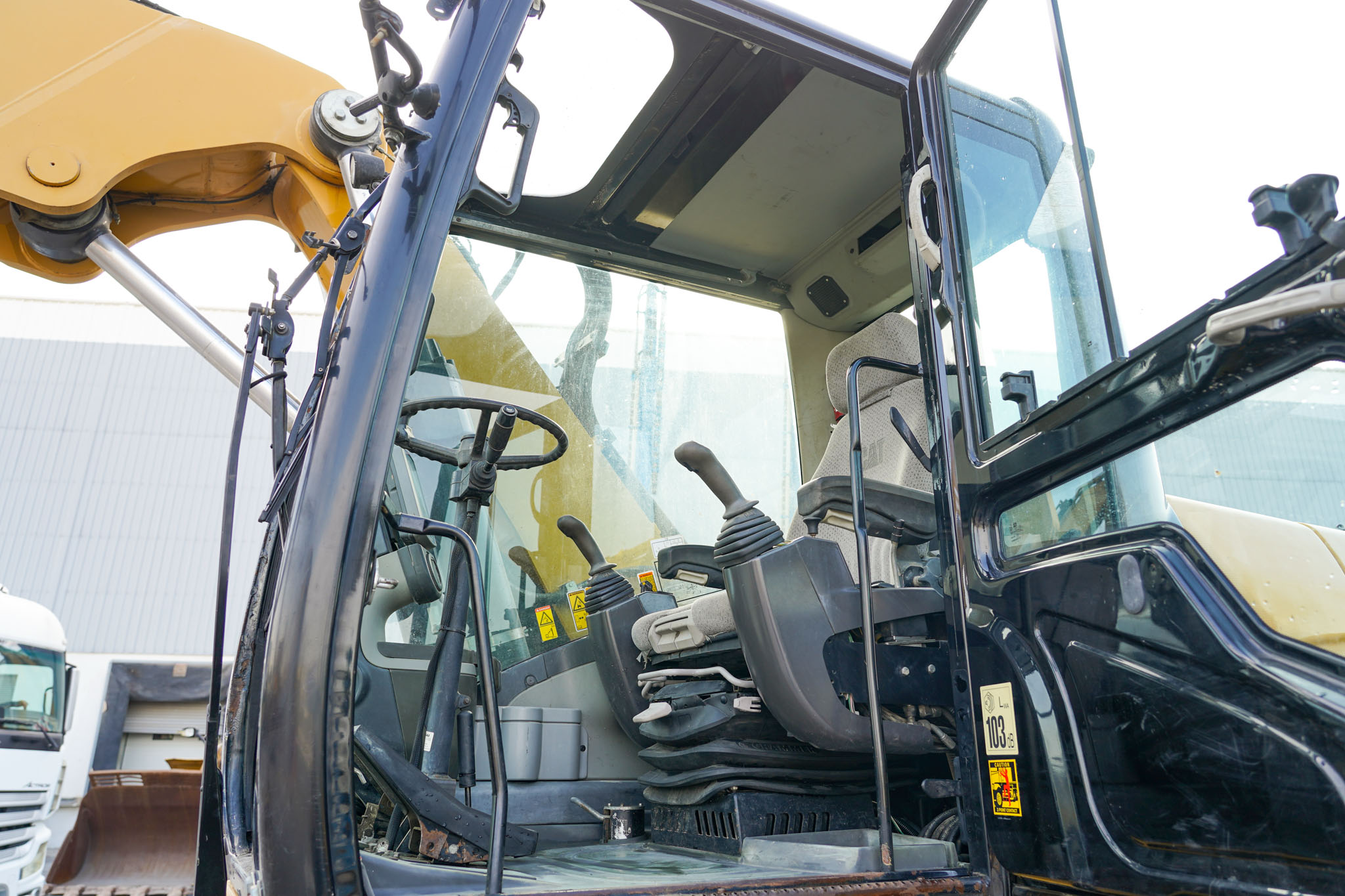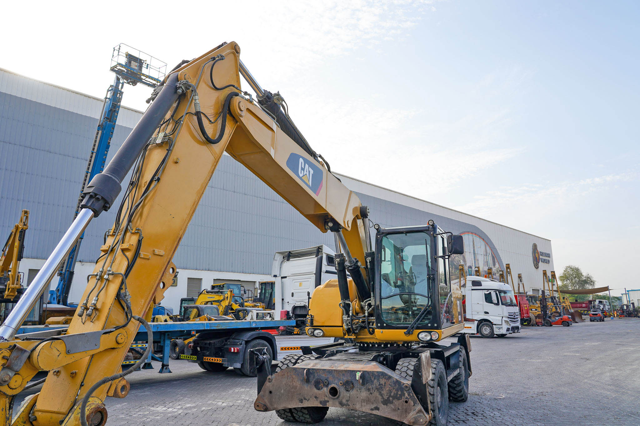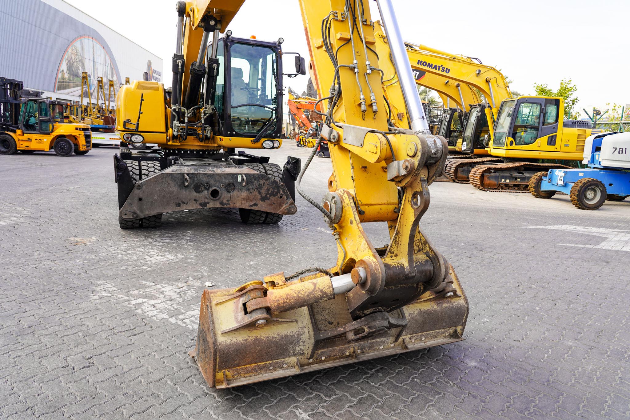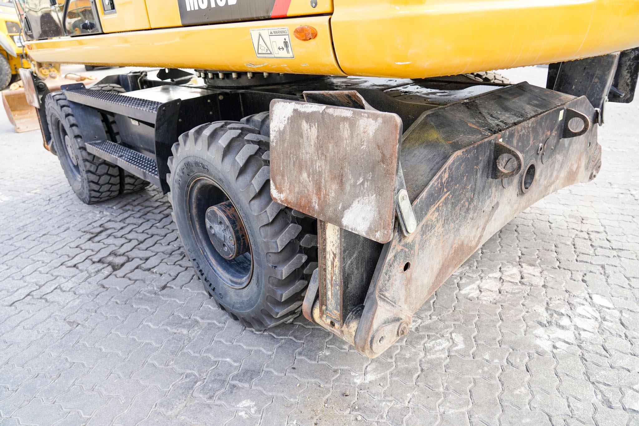 Air Conditioner, CAT 6 cylinder Diesel engine with 166-170 HP, 9 ft 2 in Stick, Auxiliary Hydraulic Plumbing, Front and Rear Stabilizers, 10.00×20 Tires, 70 in Hydraulic Tilting Bucket. EX#1457
