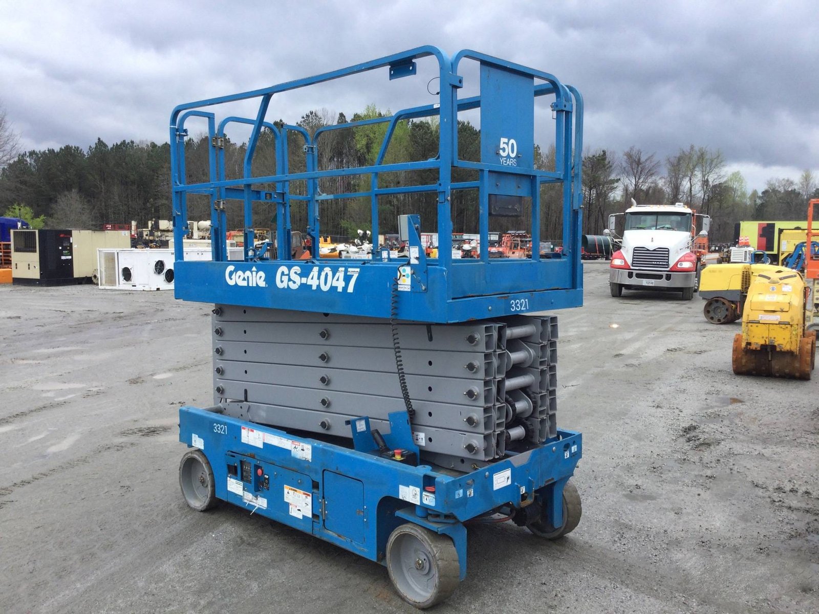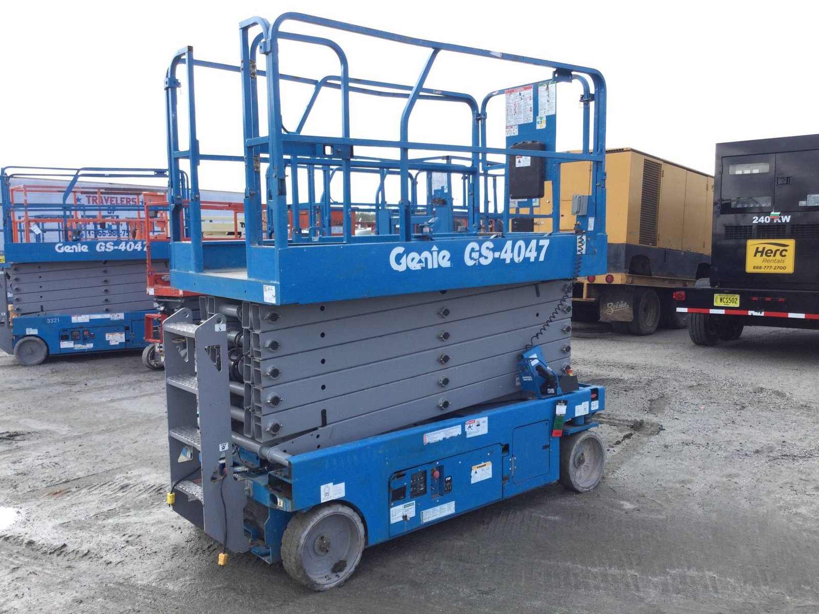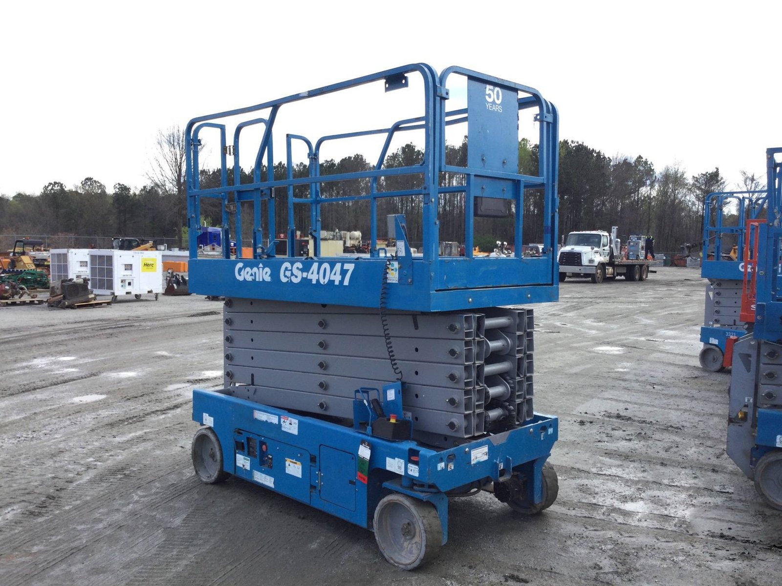 The 2016 Genie GS-4047 is a high-reach electric scissor lift, ideal for indoor tasks on firm, level surfaces. With a platform height of 39 ft (11.9 m) and a working height of 45 ft (13.9 m), it supports up to 550 lbs (249 kg). It features compact dimensions, proportional controls, and non-marking tires, offering excellent vertical reach and maneuverability in space-constrained environments.