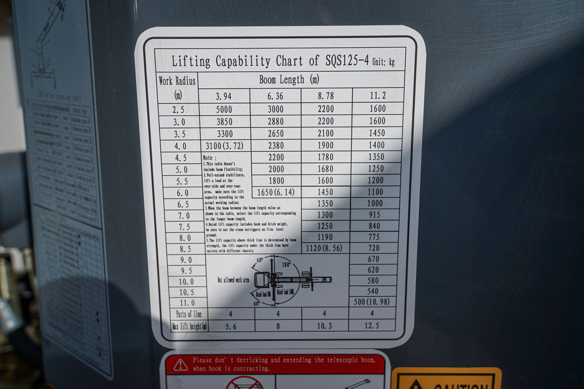 11.2 m Long 4-section Telescopic boom, 12.5 m lifting height, 5 Ton Lifting Capacity, Front and Rear Outriggers, 80 kW Yunnei Power Diesel engine, 6-Speed Manual Transmission, Air Conditioned cabin, EX#1679